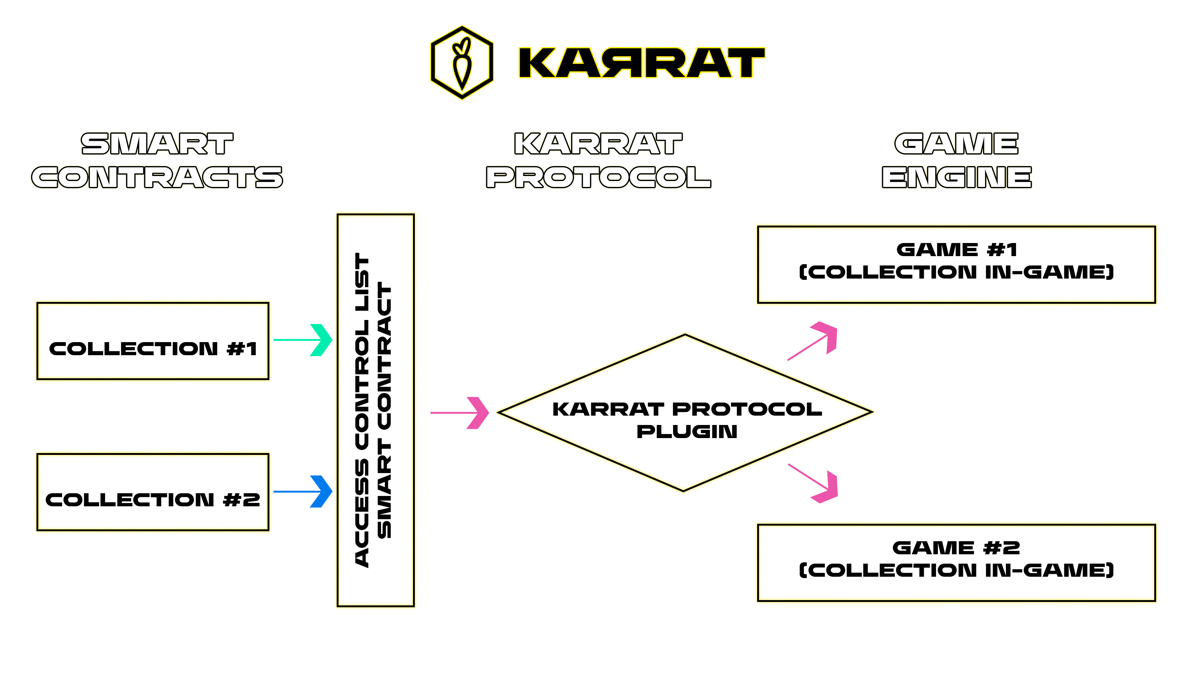 The KARRAT protocol is made up of a tool set that allows the importation of digital collectibles and their metadata into a gaming engine and allows for the assembly of such assets too, where they are 3D gaming assets, for inclusion into any given games or other experiences. This also includes a combination of an ACL Smart Contract and gaming engine blueprint plugin. The KARRATco can vote to bring collections into this system via Constitutional KIPs.